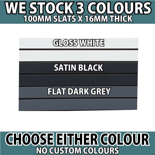 The battens and rails come in 3 colours; Satin Black, Dark Grey (like Monument) or Gloss White.